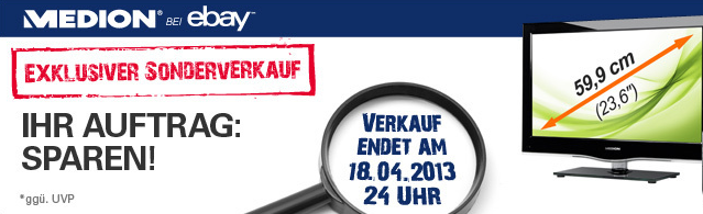 Medion hat nun auf der eBay Plattform einen kleinen Sale gestartet, bei dem ihr ordentlich abkassieren könnt. Ihr könnt dort bis zu satten 50% sparen. Bedenkt bitte, dass das Angebot zeitlich begrenzt ist und am 18.4.2013 um 23:59 Uhr endet. Neben Laptops und Smartphones stehen zum Beispiel auch Tablets und Navis zum Verkauf. Ich Blick lohnt sich auf jeden Fall, wenn man auf der Suche nach etwas Bestimmten ist. Viel Spaß beim Stöbern!