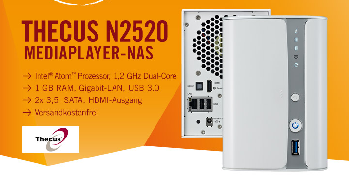 Gerade für Einsteiger ein eventuell sehr interessantes Angebot. Leute, die gerne Filme und Serien schauen, benötigen nunmal einen Mediaplayer, der auch gescheit alle Formate und Ton-Elemente abspielen kann. Bei Notebooksbilliger bekommt ihr heute als Tagesangebot den Thecus N2520, welcher ein NAS Mediaplayer mit Gbit Anbindung und HDMI Anschluss daherkommt. Ihr bekommt quasi 2 großartige Dinge geboten: NAS Server und Mediaplayer in einem Gerät, klasse!