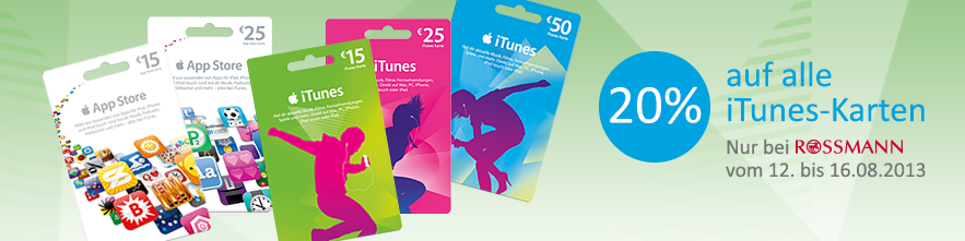Es gibt mal wieder ein super Angebot für iTunes-Karten. Dieses Mal vergibt Rossmann 20% auf alle Guthaben-Karten. Wer also des öfteren im iTunes Store einkauft, sei es Apps, Musik, Filme oder andere Dinge, kann sich mit solchen Angeboten ein paar Euro in die eigene Tasche stecken und bares Geld sparen. Ich habe von der Promo-Aktion allerdings noch nirgends gelesen, außer auf deren Internetseite, also könnt ihr davon ausgehen, dass die Karten nicht so schnell vergriffen sein werden. Schaut einfach selbst mal in euren Rossmann Store um die Ecke nach. ![]()